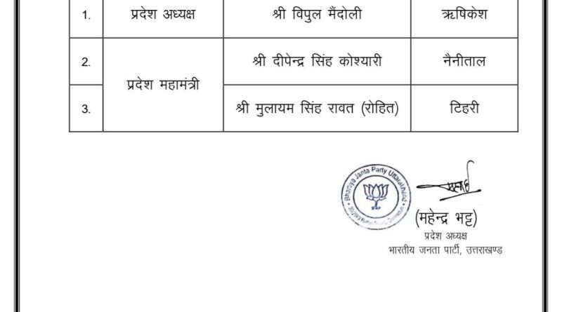 भारतीय जनता पार्टी (भाजपा) ने अपनी युवा इकाई, भारतीय जनता युवा मोर्चा (भाजयुमो) की उत्तराखंड प्रदेश इकाई के लिए नए