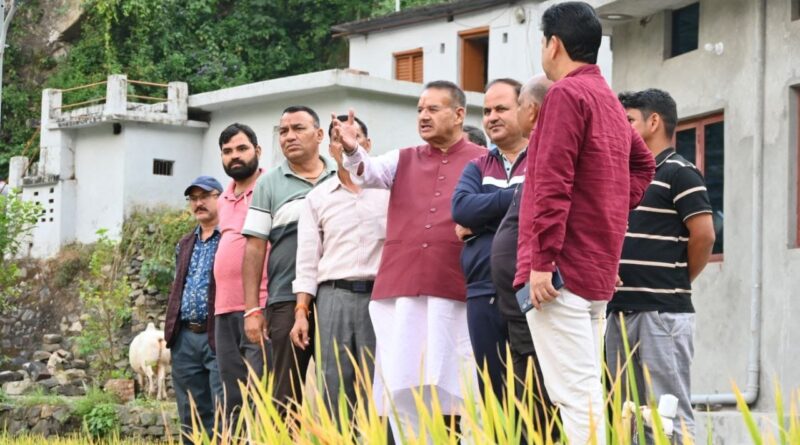 आपदा प्रभावित क्षेत्रों सरखेत और घंतूकासेरा का स्थलीय निरीक्षण करते कैबिनेट मंत्री गणेश जोशी।