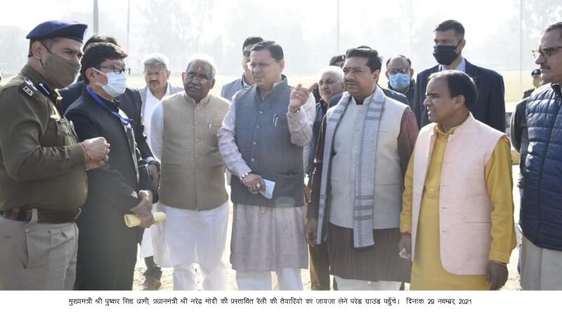 प्रधानमंत्री नरेंद्र मोदी की प्रस्तावित रैली की तैयारियों का जायजा लेने परेड ग्राउंड पहुँचे सीएम धामी