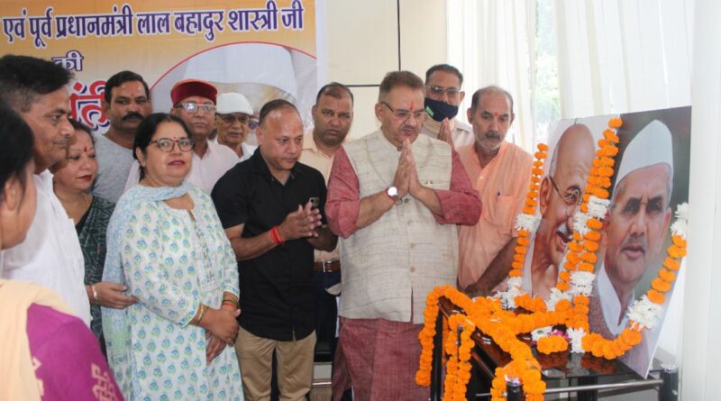 देहरादून, 02 अक्टूबर। राष्ट्रपिता महात्मा गांधी एवं पूर्व प्रधानमंत्री भारत रत्न लाल बहादुर शास्त्री की जयंती पर के अवसर पर न्यू कैंट रोड़ स्थित कैंप कार्यालय में श्रद्धांजलि कार्यक्रम का आयोजन किया गया। इस अवसर पर कैबिनेट मंत्री गणेश जोशी ने राष्ट्रपिता महात्मा गांधी एवं पूर्व प्रधानमंत्री लाल बहादुर शास्त्री की जयंती पर उनके चित्र के सम्मुख पुष्पांजलि अर्पित कर श्रद्धांजलि दी।